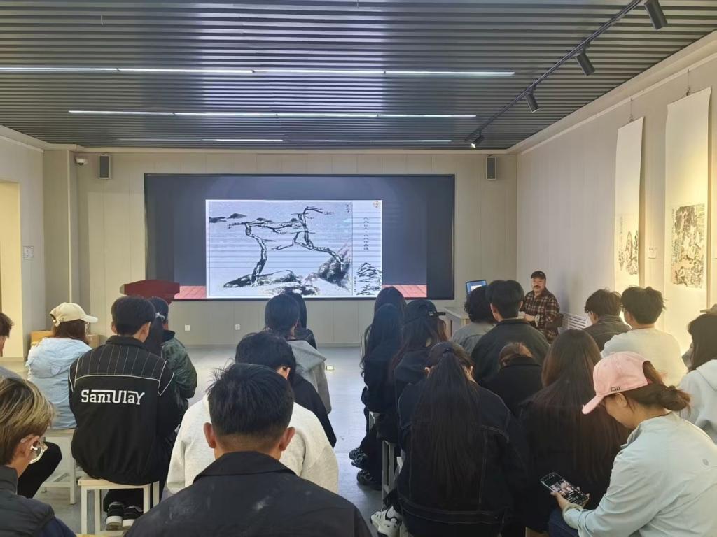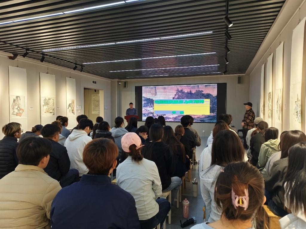 讲座中,李俊教授围绕《中国画学理与人文精神》核心主题,系统阐释了中国画的学理根基、文化内涵与精神内核。他结合中国传统绘画经典作品与自身数十年创作实践,深入解读了中国画“以形写神”“天人合一”的哲学思想,梳理了中国画从传统到当代的发展脉络,剖析了笔墨技法背后承载的人文情怀与文化传承,分享了在材料技法、创作研究中的学术探索与实践感悟。讲座内容兼具理论深度与实践价值,逻辑严谨、内容详实,为在场师生搭建了系统的知识框架,带来了深刻的学术启发。